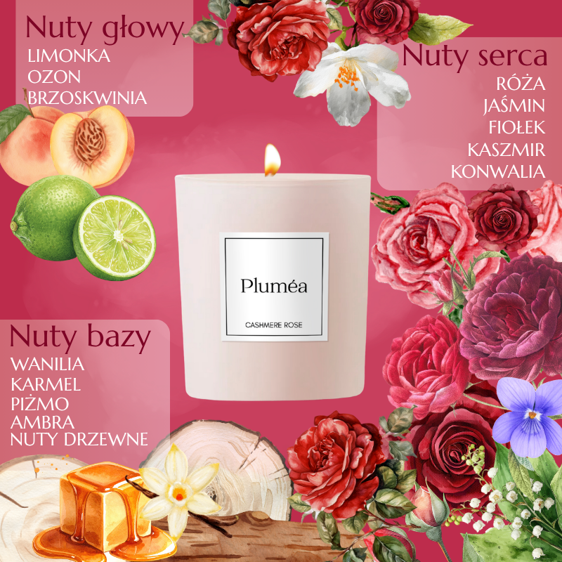 CASHMERE ROSE to elegancka, zmysłowa kompozycja, w której świeżość owoców i lekkość kwiatów spotykają się z miękką, otulającą bazą. Zapach wypełnia wnętrze subtelną, luksusową aurą, tworząc atmosferę spokoju, harmonii i kobiecej delikatności.
